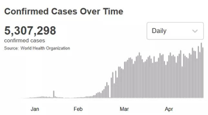 根據世衛組織最新實時統計數據,截至北京時間5月26日0時42分,全球累計新冠肺炎確診病例5307298例,死亡病例342070例。