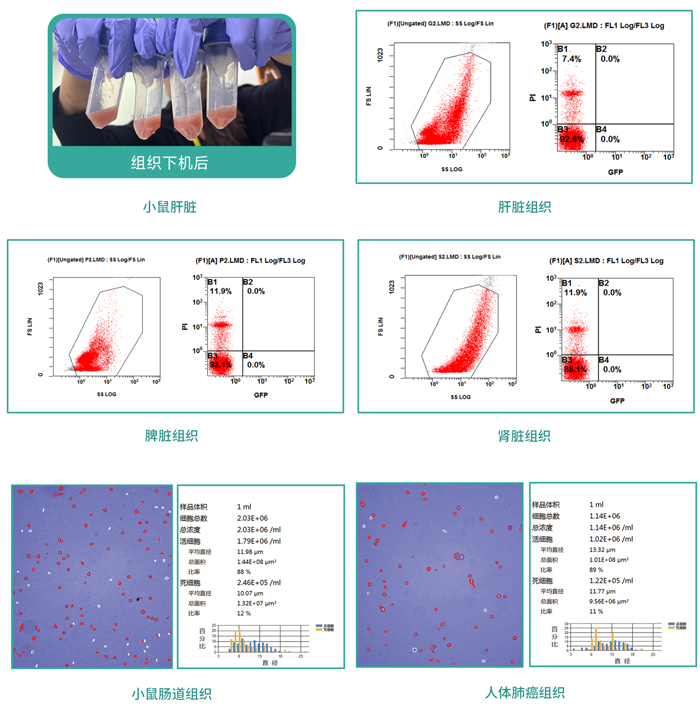 樣品通過雙向的機械切割與消化酶混合作用,通過恒溫消化,組織剪切,得到高濃度的活細胞懸液。后續(xù)經(jīng)過消化終止,過濾洗滌,必要時加以紅細胞裂解等步驟,可得到千萬到百萬級別的活細胞,不同的組織均可以達到90%以上的細胞得率。